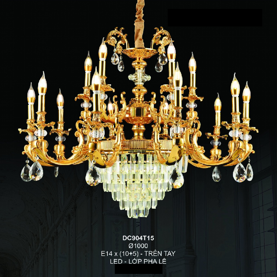 - Sản phẩm: 35 - DC904T15: Đèn chùm nến 15 tay - KT: Ø1000mm - Bóng đèn nến chân E14 x 15 bóng + Đèn LED