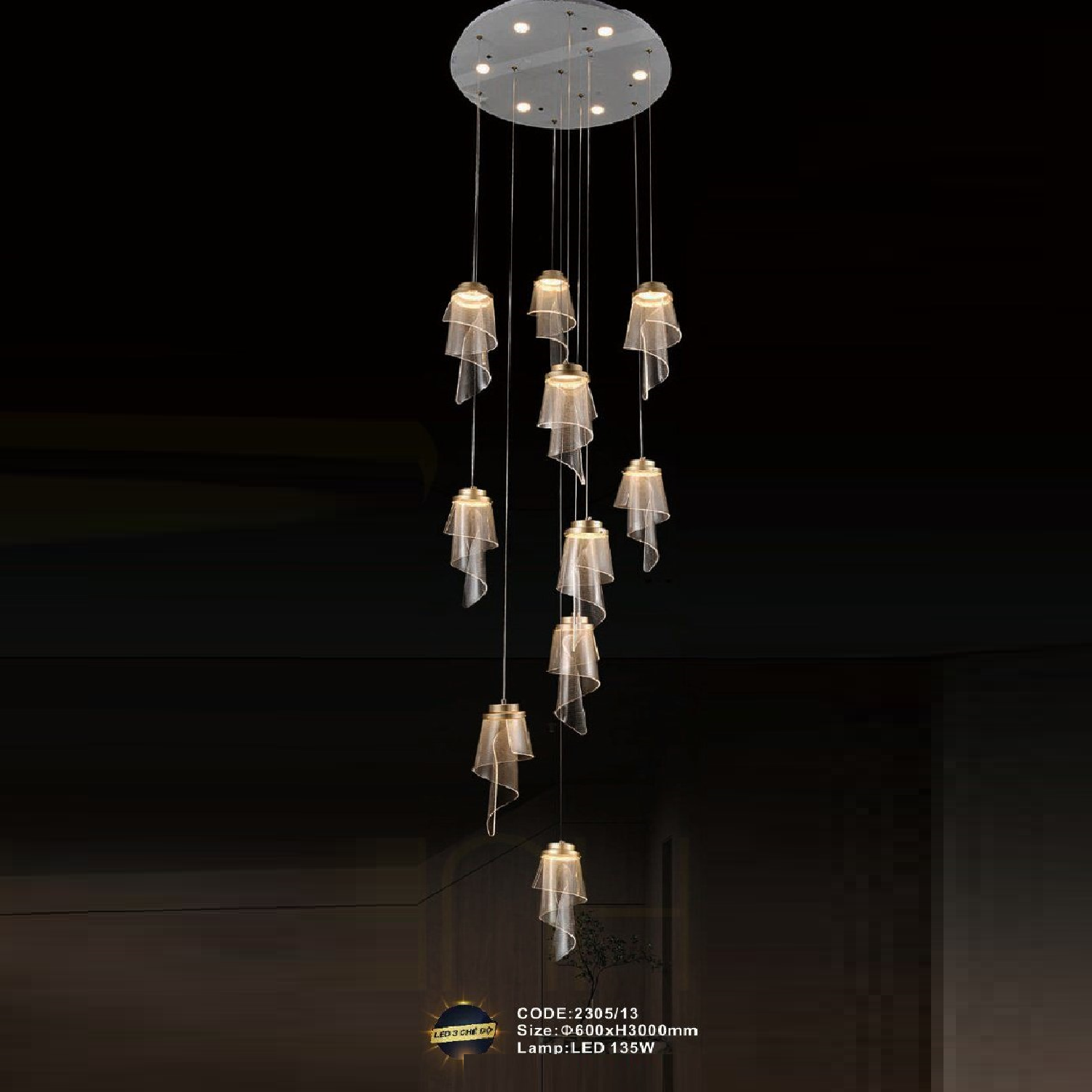 - Sản phẩm: CODE: 2305/13: Đèn thả 13 chao đèn LED - KT: Ø600mm x H3000mm - Đèn LED 135W đổi 3 màu