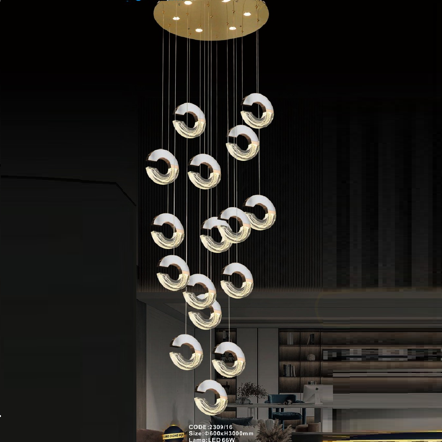 5. CODE: 2309/16: Đèn thả 16 vòng đèn LED - KT: Ø600mm x H3000mm - Đèn LED 66W ánh sáng đổi 3 màu