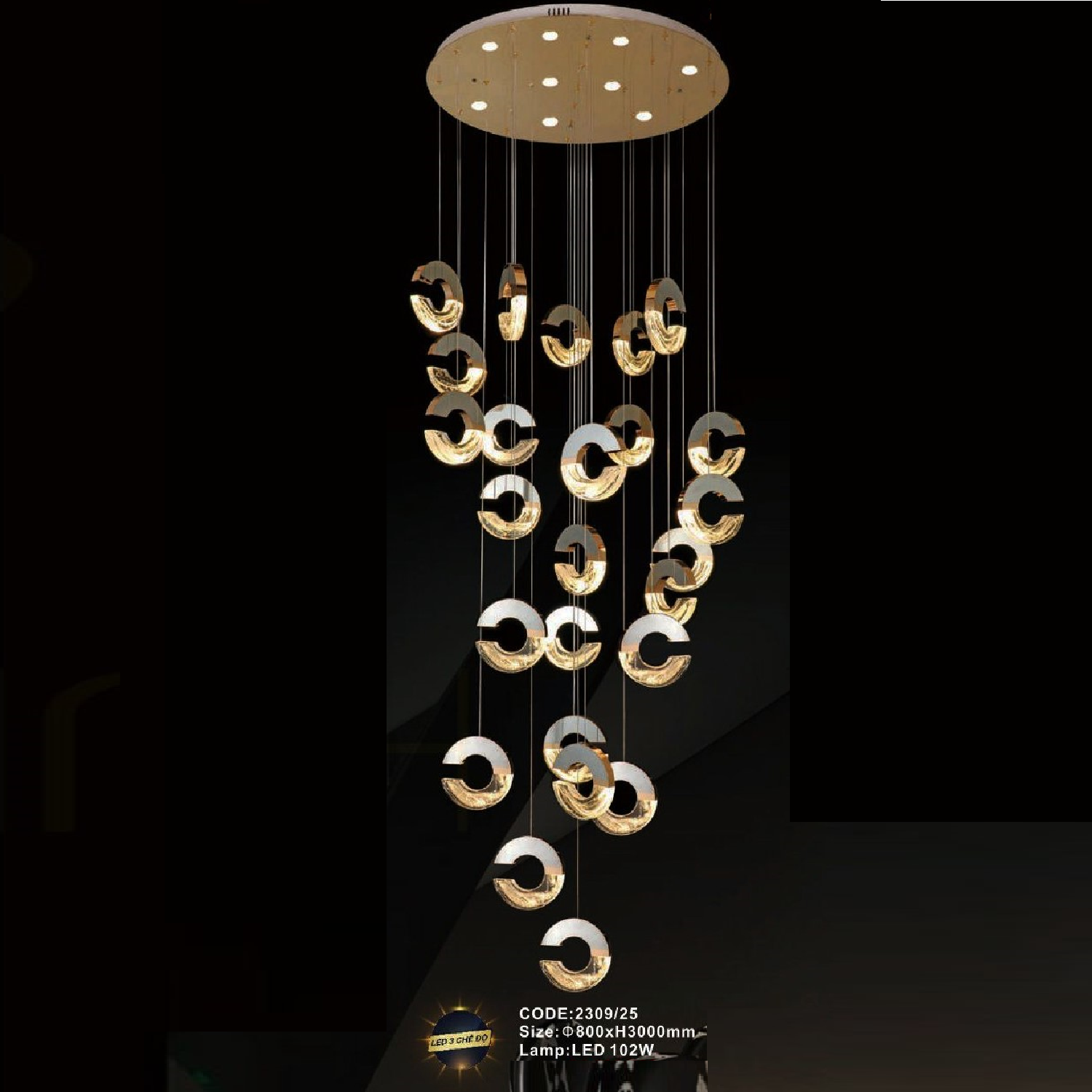 • Sản phẩm: CODE: 2309/25: Đèn thả 25 vòng đèn LED - KT: Ø800mm x H3000mm - Đèn LED 102W đổi 3 màu