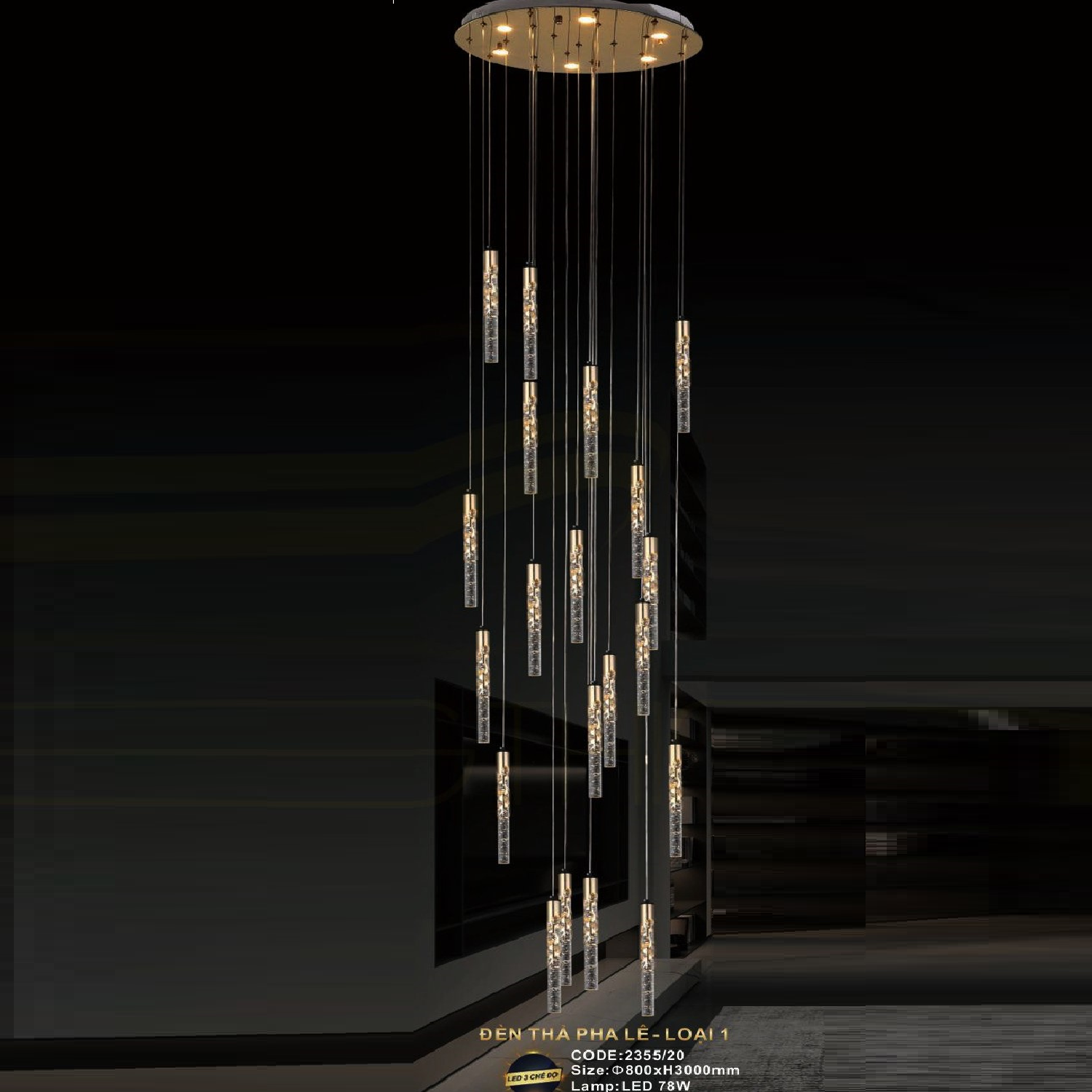 5. CODE: 2355/20: Đèn thả 20 ống đèn LED - KT: Ø800mm x H3000mm - Đèn LED 78W ánh sáng đổi 3 màu