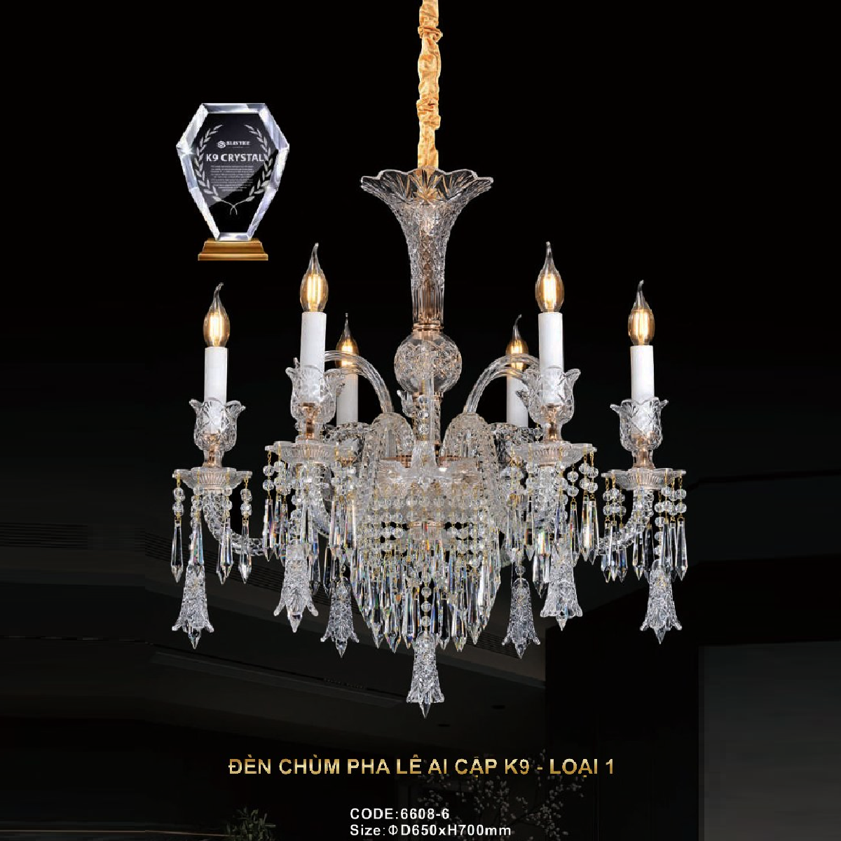 - Sản phẩm: CODE: 6008 - 6: Đèn chùm Phale nến 6 tay - KT: Ø650mm x H700mm - Bóng đèn chân E14 x 6 bóng