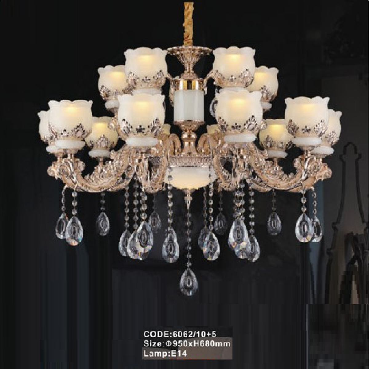 - Sản phẩm: CODE: 6062/10+5: Đèn chùm 15 tay chao thủy tinh - KT: Ø950mm x H680mm - Bóng đèn E14 x 15 bóng