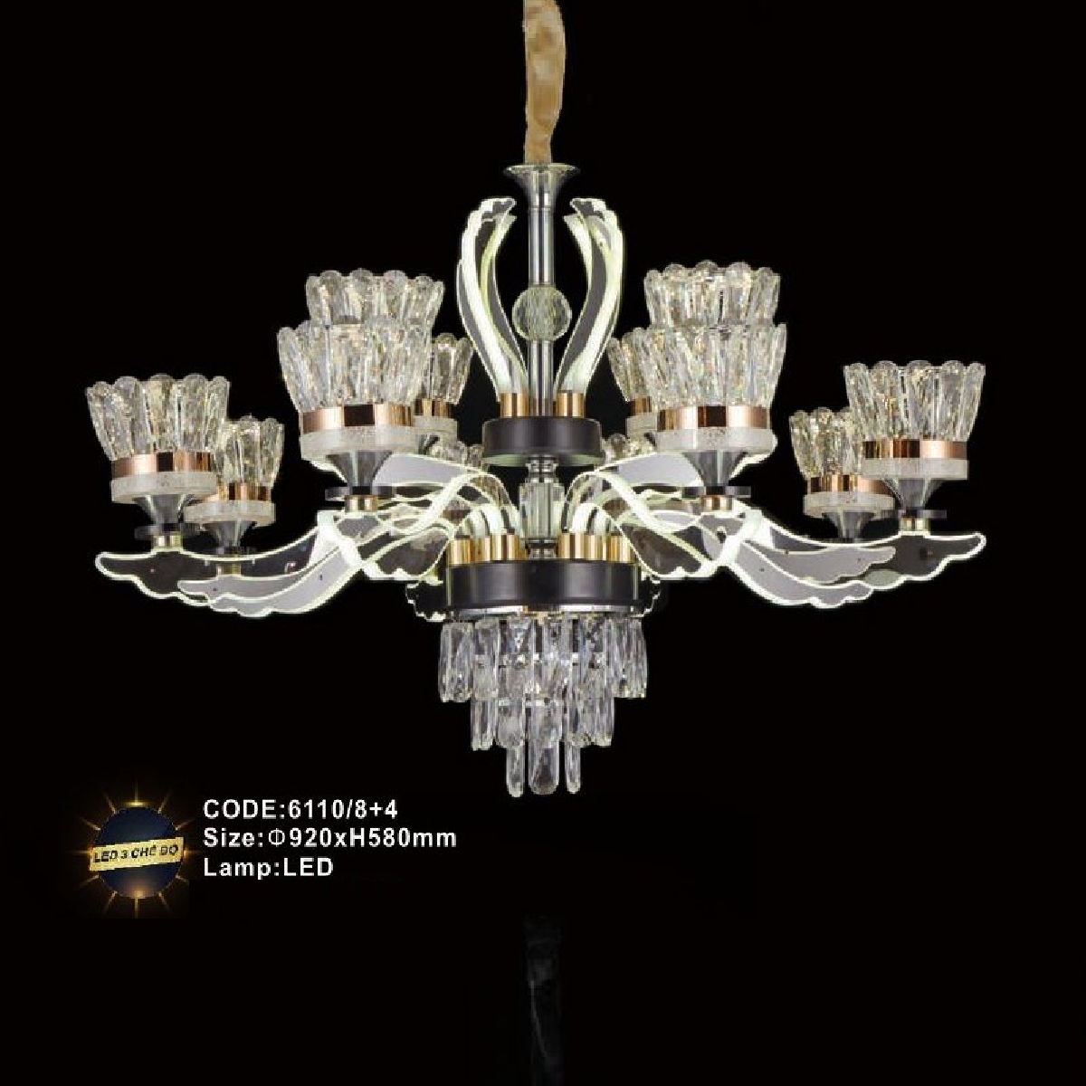- Sản phẩm: CODE: 6110/8+4: Đèn chùm LED 12 tay - KT: Ø920mm x H580mm - Đèn LED đổi 3 màu
