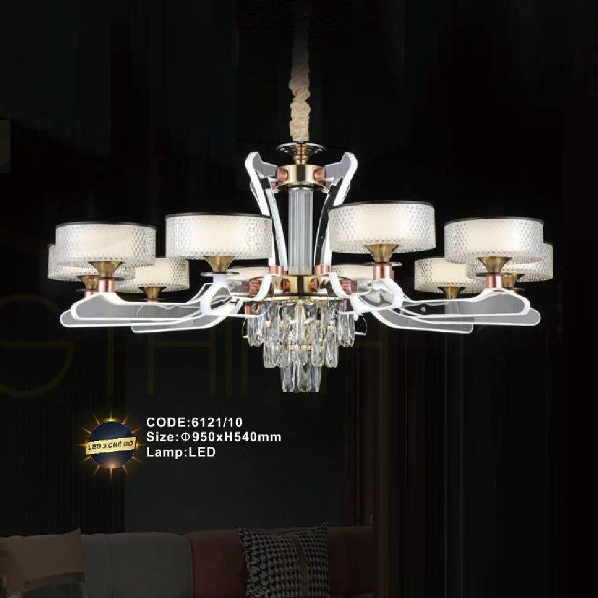 - Sản phẩm: CODE: 6121/10: Đèn chùm LED 10 tay - KT: Ø950mm x H540mm - Đèn LED đổi 3 màu