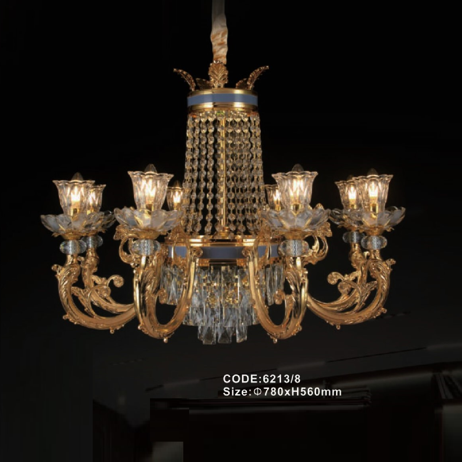 5. CODE: 6213/8: Đèn chùm Phale nến 6 tay, chao thủy tinh - KT: Ø780mm x H560mm - Bóng đèn E14 x 8 bóng + Đèn LED