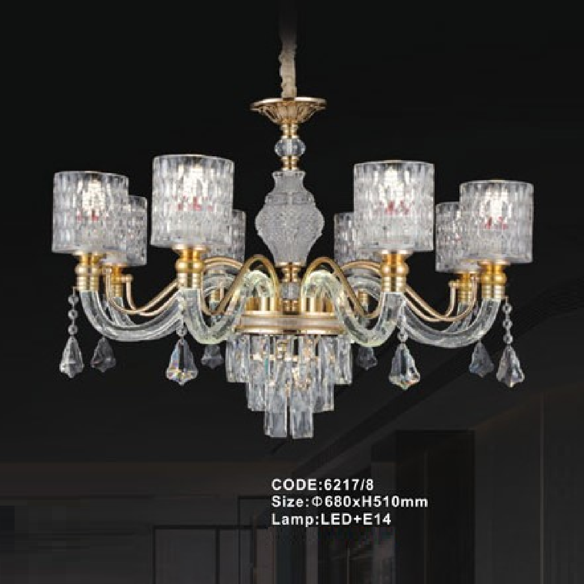 5. CODE: 6217/8: Đèn chùm 8 tay - KT: Ø680mm x H510mm - Bóng đèn E14 x 8 bóng + Đèn LED