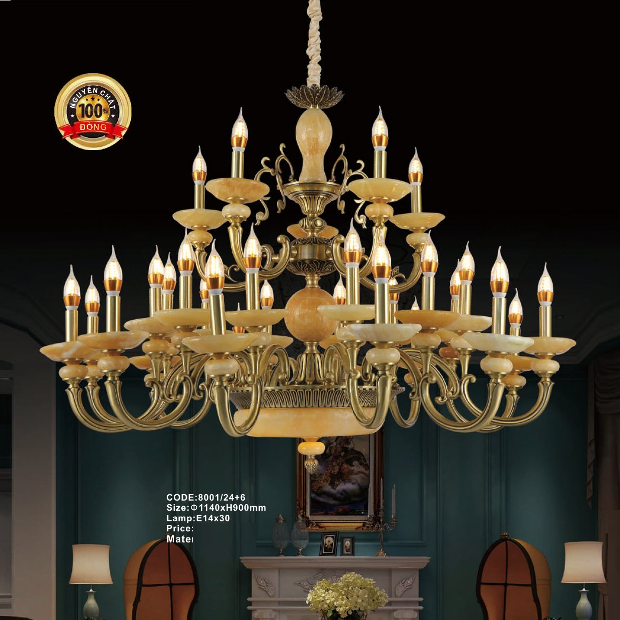 - Sản phẩm: CODE: 8001/24+6: Đèn chùm đồng nến 30 tay - KT: Ø1140mm x H900mm - Bóng đèn nến E14 x 30 bóng