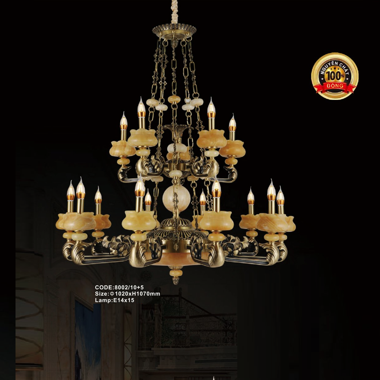 • Sản phẩm: CODE: 8002/10+5: Đèn chùm đồng chao đá 15 tay - KT: Ø1020mm x H1070mm - Bóng đèn E14 x 15 bóng