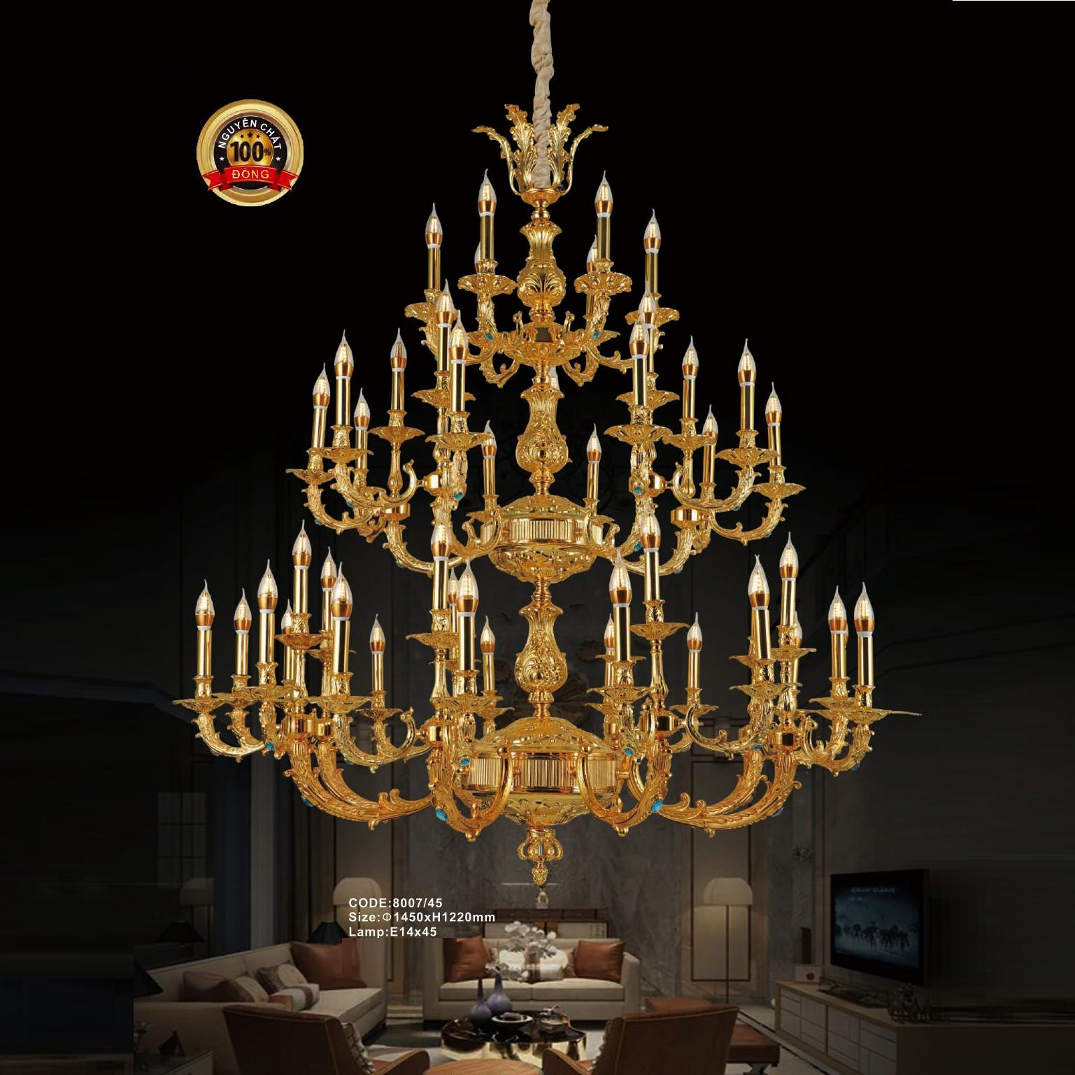 5. CODE: 8007/45: Đèn chùm đồng nến 45 tay - KT: Ø1450mm x H1220mm - Bóng đèn nến E14 x 45 bóng