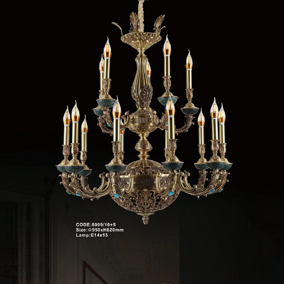 - Sản phẩm: CODE: 8009/10+5: Đèn chùm đồng nến 15 tay - KT: Ø950mm x H620mm - Bóng đèn chân E14 x 15 bóng