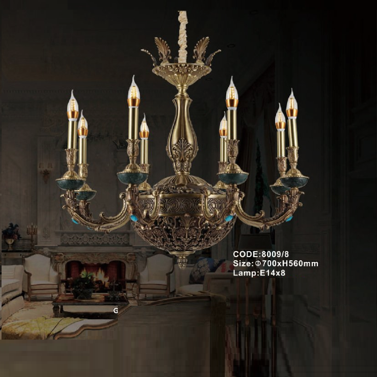 5. CODE: 8009/8: Đèn chùm đồng nến 8 tay - KT: Ø700mm x H560mm - Bóng đèn chân E14 x 8 bóng