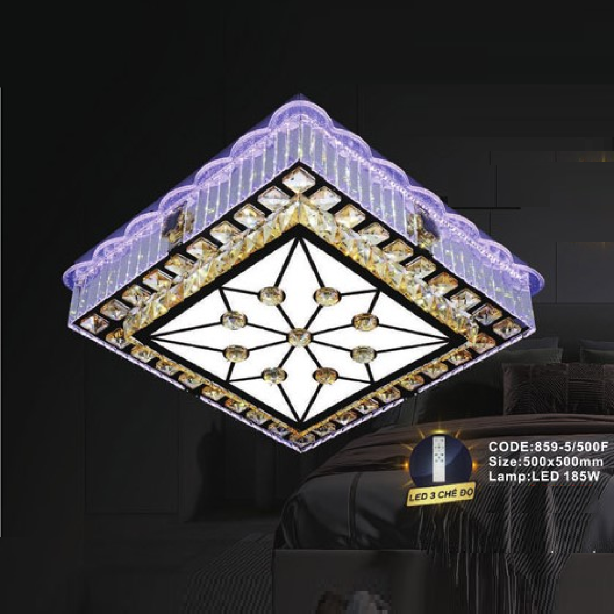 - Sản phẩm: CODE: 859-5/500F: Đèn áp trần vuông LED - KT: L500mm x W500mm - Đèn LED 185W đổi 3 màu