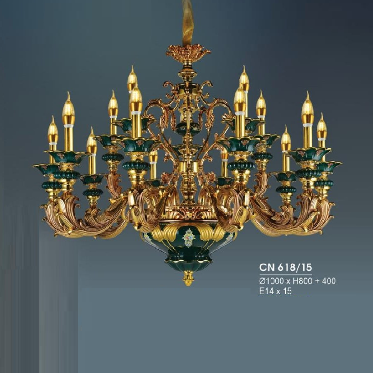 HF - CN 618/15: Đèn chùm nến 15 tay - KT: Ø1000mm x H800mm + 400mm - Đèn nến chân E14 x 15 bóng
