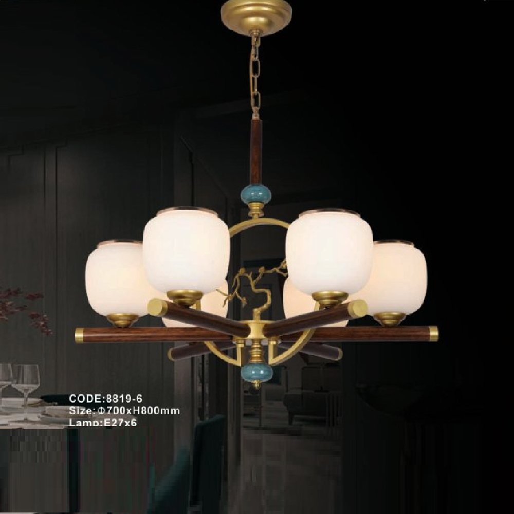 - Sản phẩm: CODE: 8819-6: Đèn chùm 6 tay, chao thủy tinh - KT: Ø700mm x H800mm - Bóng đèn E27 x 6 bóng