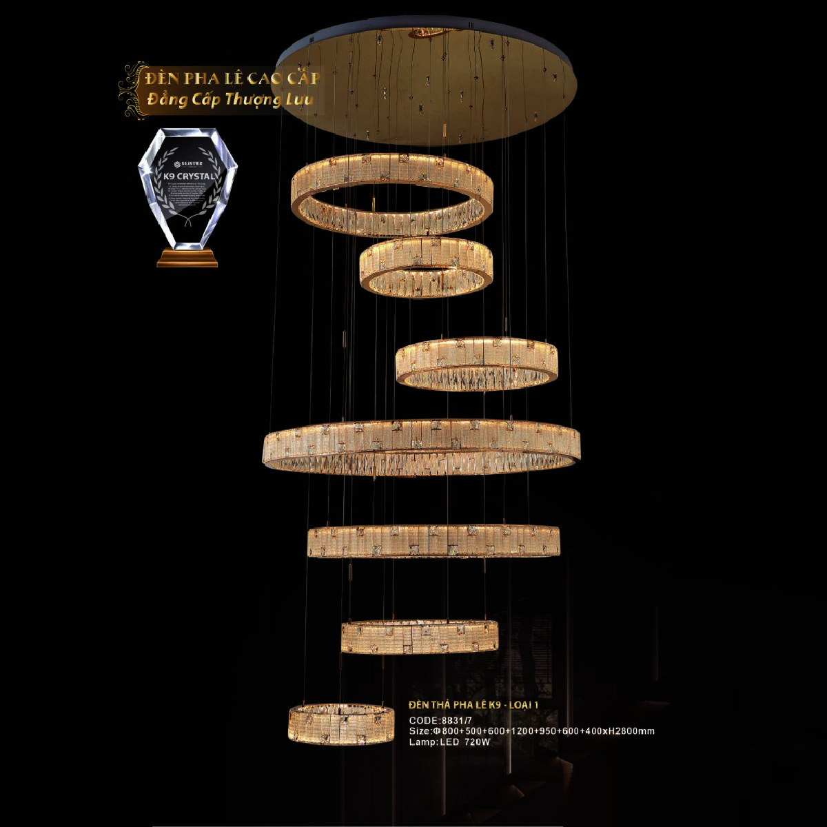 • Sản phẩm: CODE: 8831/7: Đèn thả 7 vòng LED Phale - KT: Ø(800+500+600+1200+950+800 +400)mm x H2800mm - Đèn LED 720W