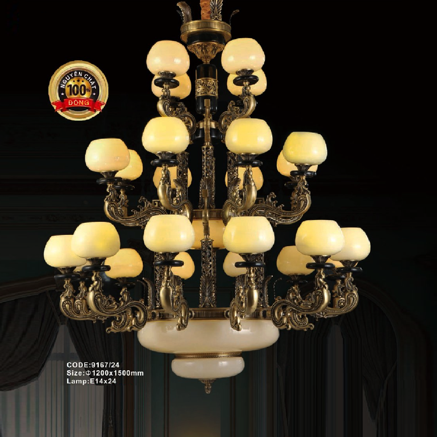 - Sản phẩm: CODE: 9167/24: Đèn chùm đồng chao đá 24 tay - KT: Ø1200mm x H1500mm - Bóng đèn chân E14 x 24 bóng