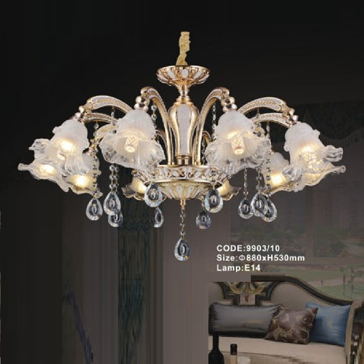 5. CODE: 9903/10: Đèn chùm 10 tay chao thủy tinh - KT: Ø880mm x H530mm - Bóng đèn E14 x 10 bóng