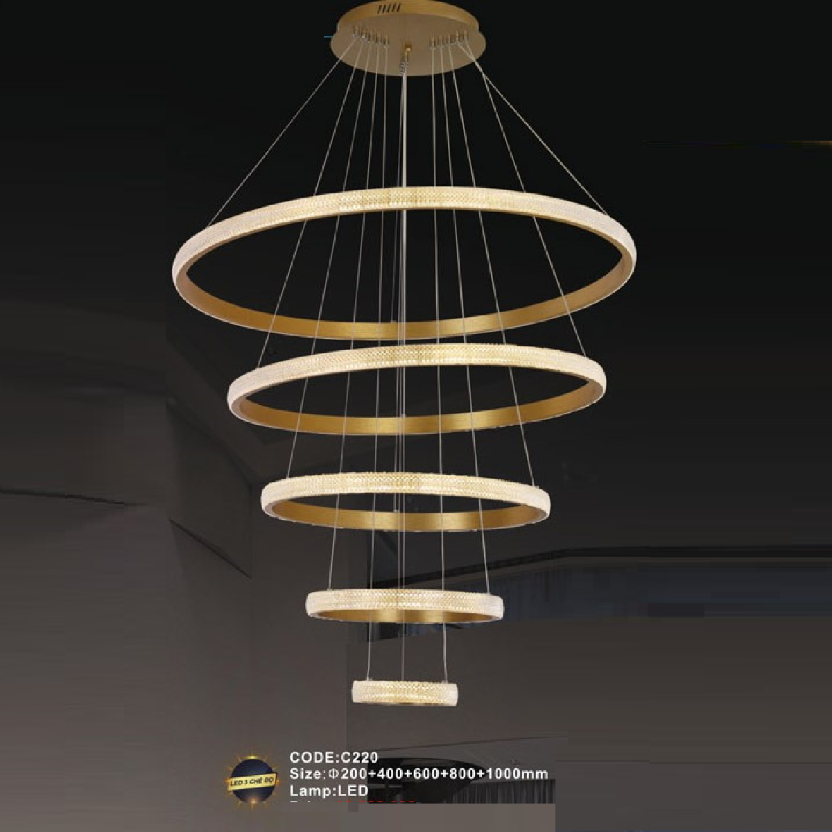 - Sản phẩm: CODE: C220: Đèn thả 5 vòng LED - KT: Ø(200+400+600+800+1000)mm - Đèn LED ánh sáng đổi 3 màu