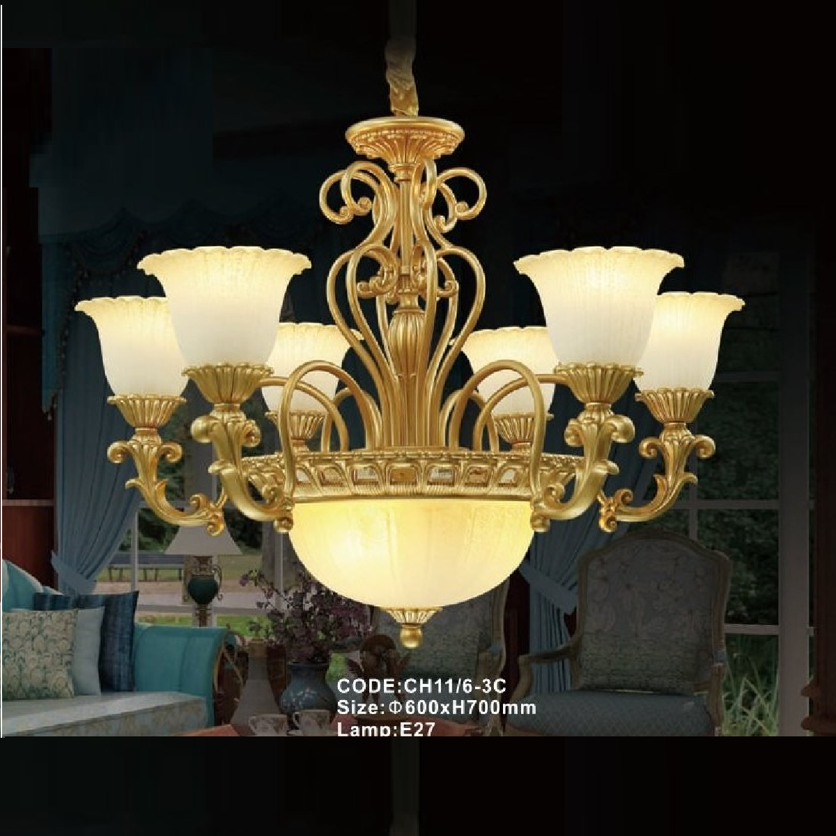 - Sản phẩm: CODE: CH11/6-3C: Đèn chùm 6 tay, chao thủy tinh - KT: Ø600mm x H700mm - Bóng đèn E27 x 9 bóng