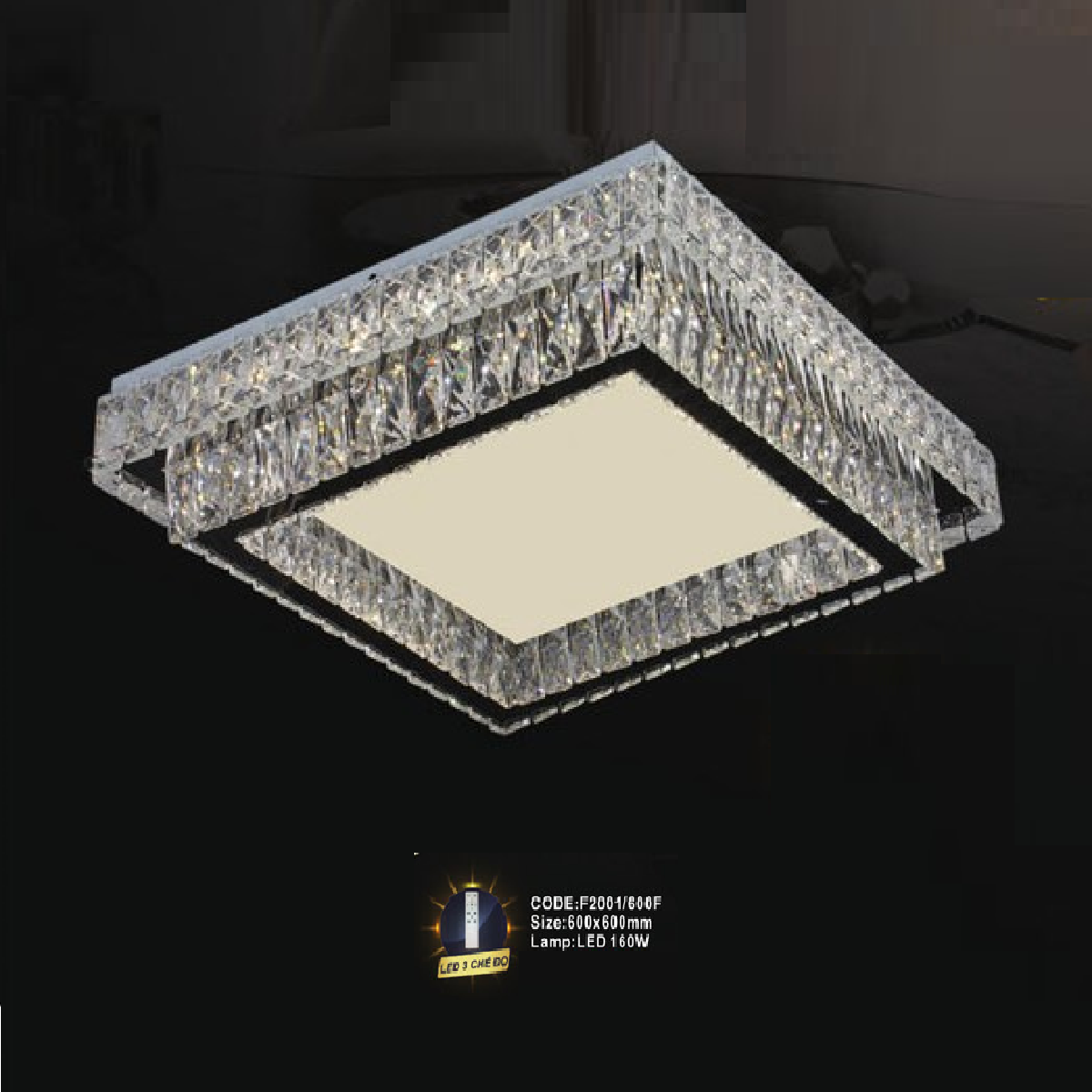 CODE: F2001/600F: Đèn áp trần vuông LED - KT: L600mm x W600mm - Đèn LED 160W, ánh sáng đổi 3 màu