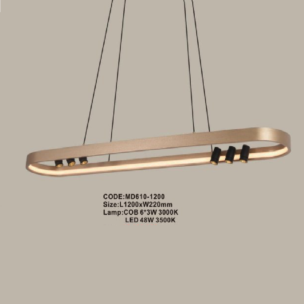 CODE: MD610 -1200: Đèn thả vòng LED - KT: L1200mm x W220mm - Đèn LED COB 6x3W ánh sáng vàng 3000K + Đèn LED 45W ánh sáng vàng 3500K