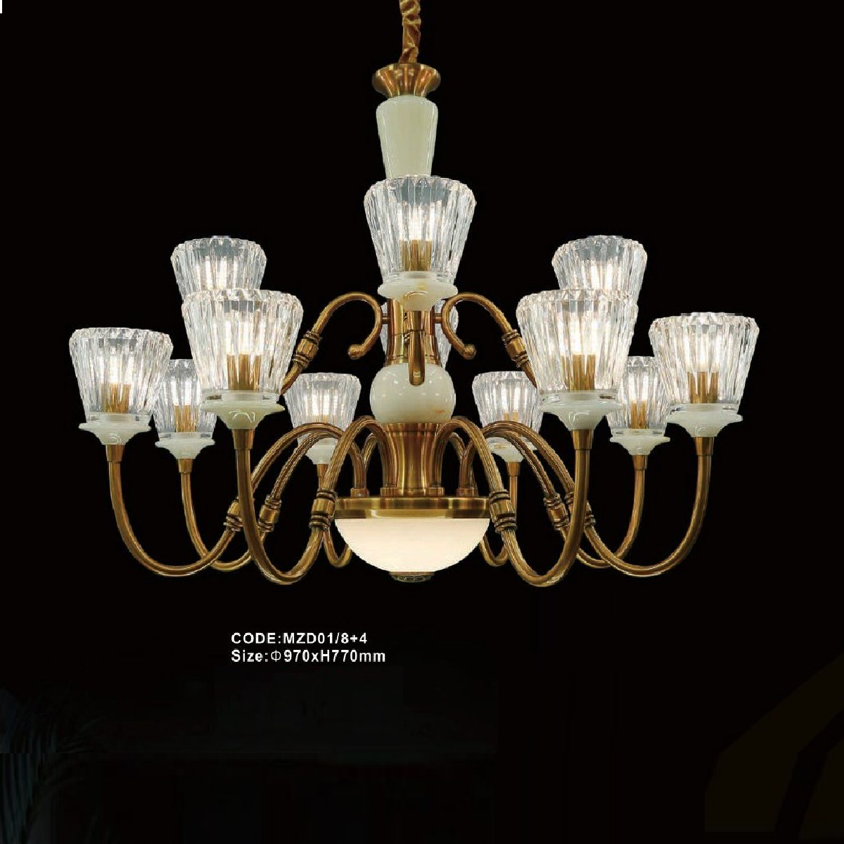 - Sản phẩm: CODE: MZD01/8+4: Đèn chùm 12 tay, chao thủy tinh - KT: Ø970mm x H770mm - Đèn LED