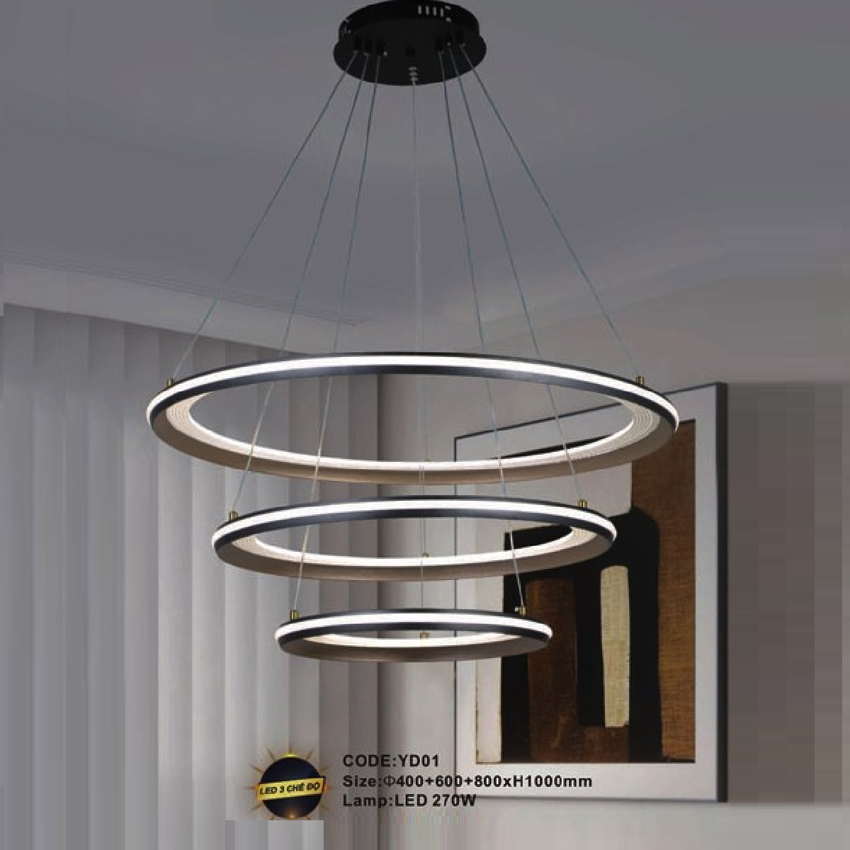 • Sản phẩm: CODE: YD01: Đèn thả 3 vòng LED - KT: Ø(400+600+800)mm x H1000mm - Đèn LED 270W ánh sáng đổi 3 màu