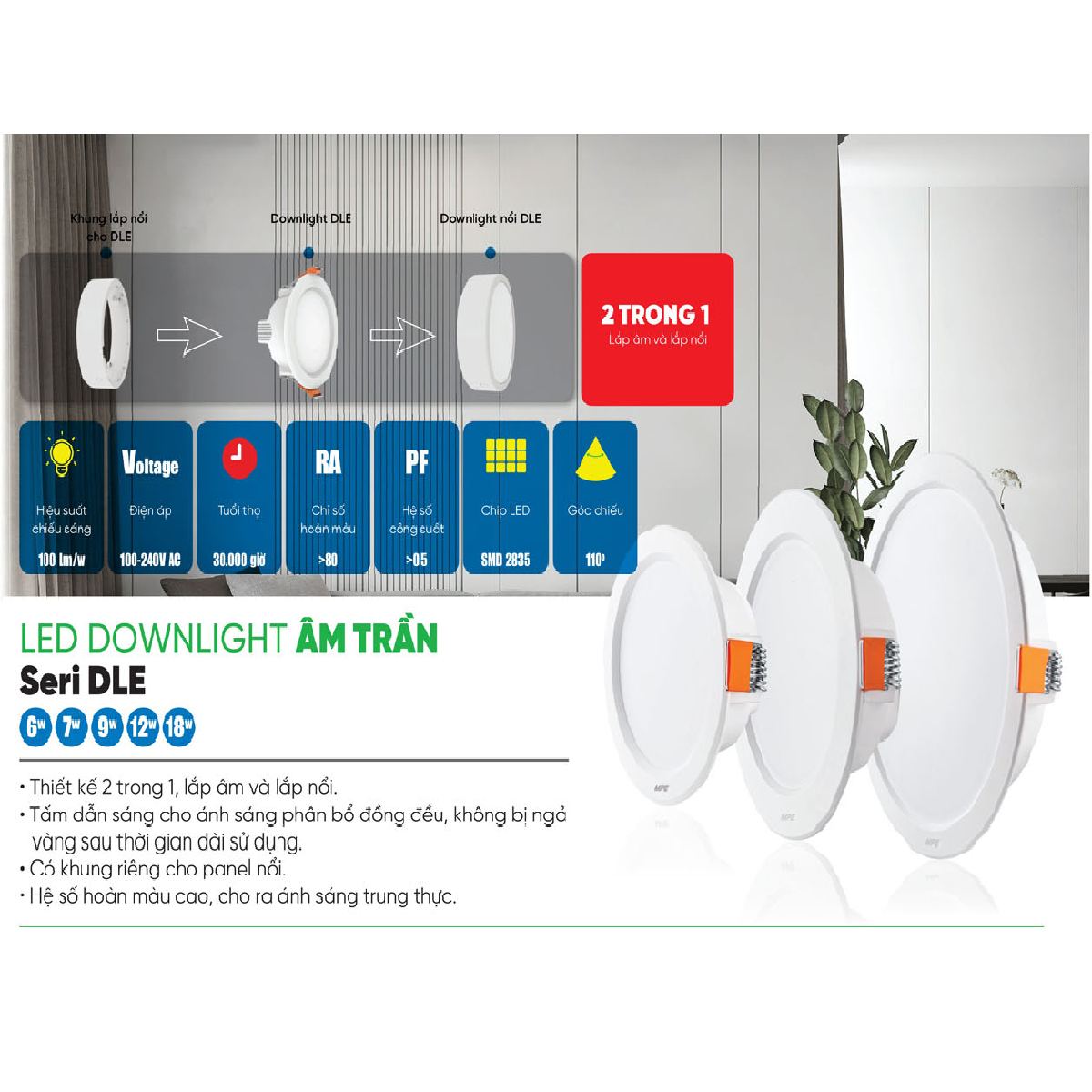 • Sản phẩm: DLEL- 9/3C: Đèn LED âm trần gắn âm hoặc nổi 9W đổi màu