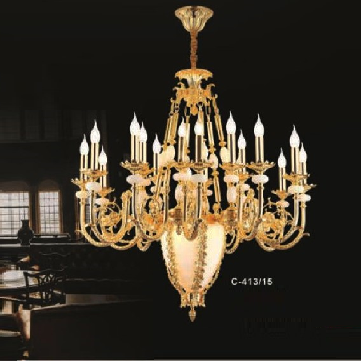 E - C - 413/15: Đèn chùm nến 15 tay chao đáy thủy tinh - KT: Ø920mm x H1000mm + 500mm - Bóng đèn nến E14 x 15 bóng
