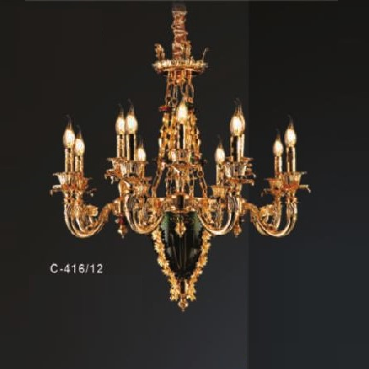- Sản phẩm: E - C - 416/12: Đèn chùm nến 12 tay chao đáy thủy tinh màu - KT: Ø800mm x H800mm + 500mm - Bóng đèn nến E14 x 12 bóng