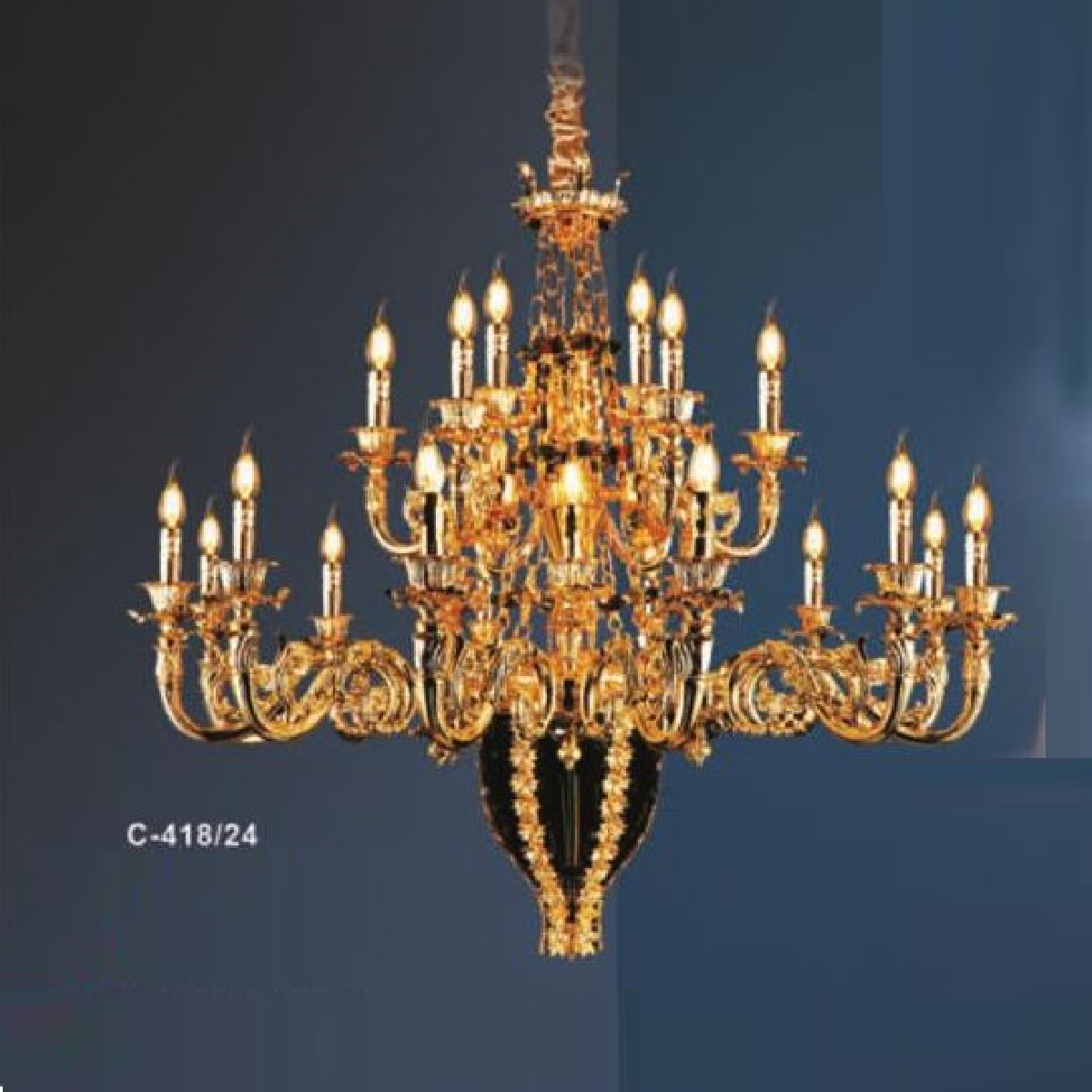 E - C - 418/24: Đèn chùm nến 24 tay chao đáy thủy tinh màu - KT: Ø1200mm x H1200mm + 500mm - Bóng đèn nến E14 x 24 bóng