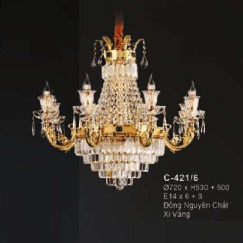 - Sản phẩm: E - C - 421/6: Đèn chùm nến Phale 6 tay - KT: Ø720mm x H530mm + 500mm - Bóng đèn E14 x 14 bóng
