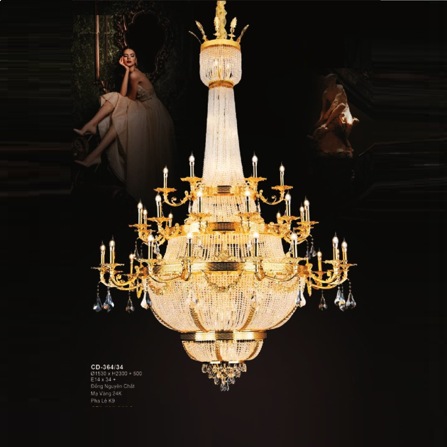 - Sản phẩm: E - CD - 364/34: Đèn chùm đồng nguyên chất mạ vàng 24K phale K9 - KT: Ø1530mm x H2300mm + 500mm - Bong đèn E14 x 34 bóng