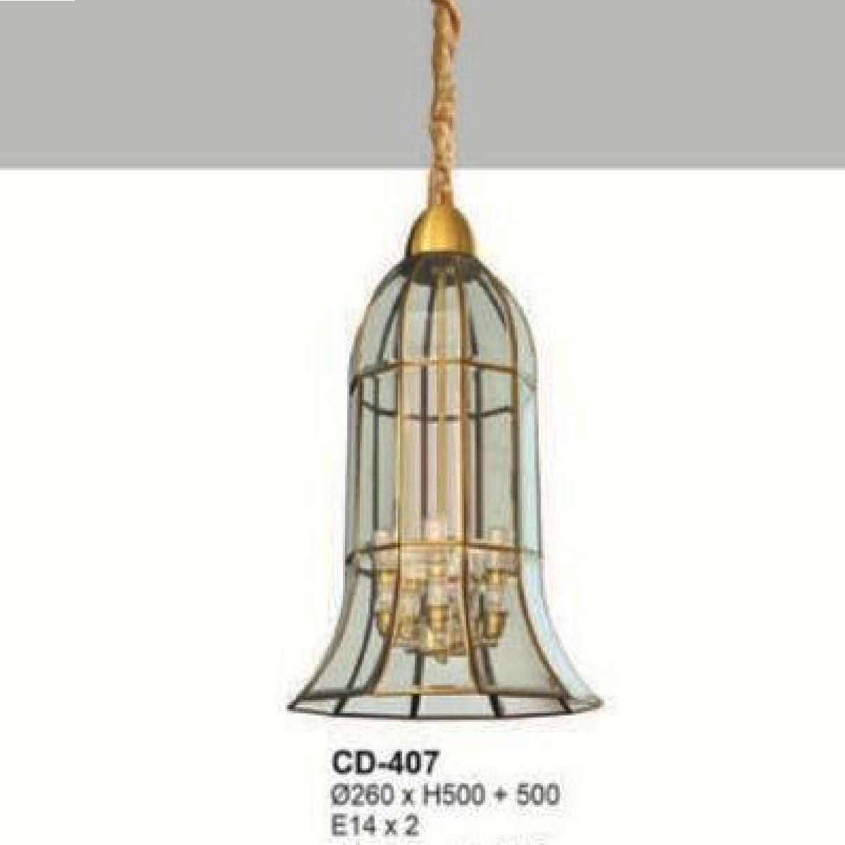 - Sản phẩm: E - CD - 407: Đèn thả đồng - KT: Ø260mm x H500mm +500mm - Bóng đèn E14 x 2 bóng