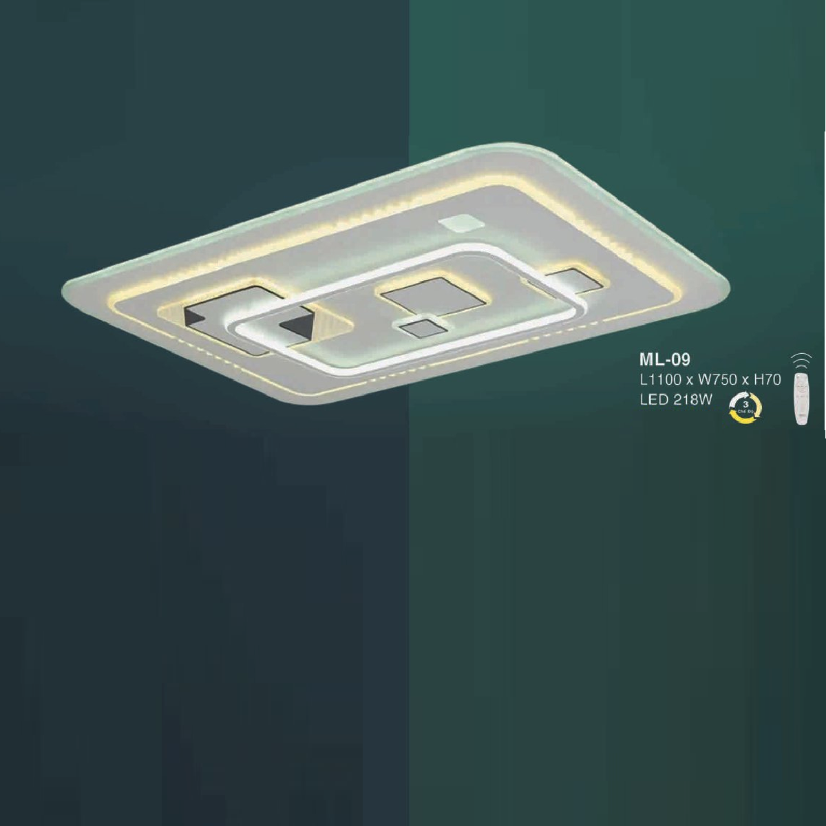 E - ML - 09: Đèn áp trần LED chữ nhật - KT: L1100mm x W750mm x H70mm - Đèn LED 218W ánh sáng đổi 3 màu - Remote