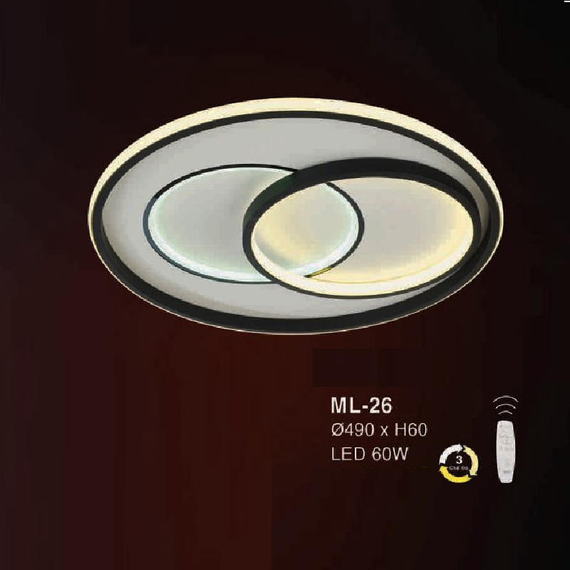 • Sản phẩm: E - ML - 26: Đèn áp trần LED Mica - KT: Ø490mm x H60mm - Đèn LED 60W ánh sáng đổi 3 màu - Remote