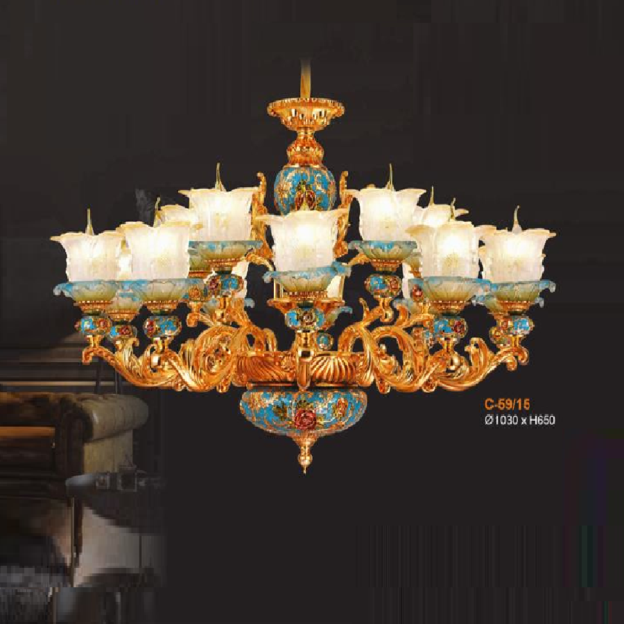• Sản phẩm: EU - C - 59/15: Đèn chùm 15 tay - KT: Ø1000mm x H650mm - Bóng đèn E14 x 15 bóng
