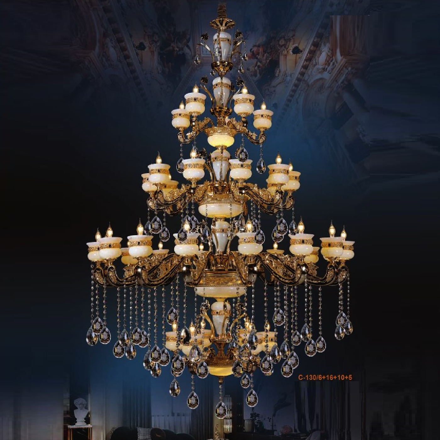 • Sản phẩm: E - C - 130/6+16+10+5: Đèn chùm 37 tay chao đá - KT: Ø1600mm x H2500mm - Bóng đèn E14 x 37 bóng + Đèn LED