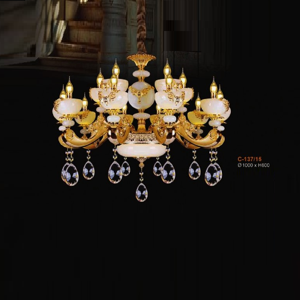 E - C-137/15: Đèn chùm 15 tay chao đá bạch ngọc - KT: Ø1000mm x H600mm - Bóng đèn E14 x 15 bóng + Đèn LED