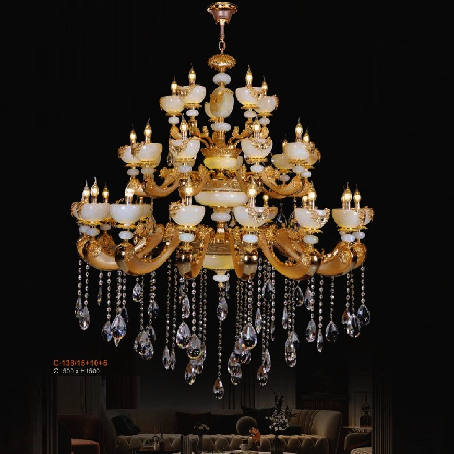 E - C - 138/15+10+5: Đèn chùm nến 30 tay chao đá - KT: Ø1500mm x H1500mm - Bóng đèn E14 x 30 bóng + Đèn LED