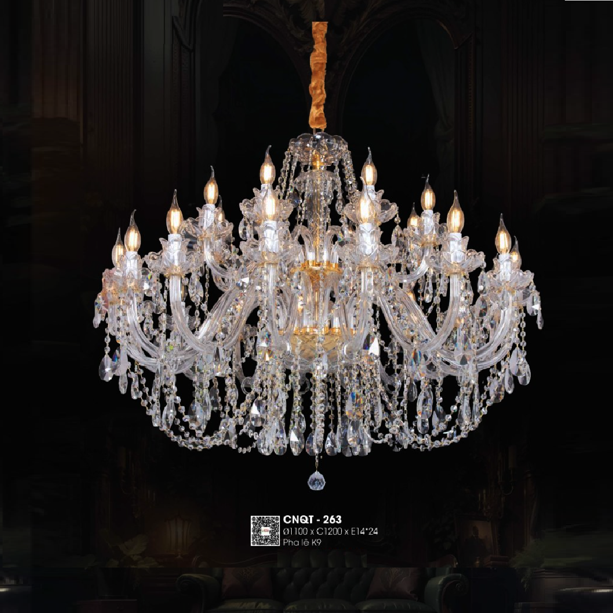 - Sản phẩm: CNQT - 263: Đèn chùm nến phale K9 24 tay - KT: Ø1100 mm x H1200mm - Bóng đèn nến E14 x 24 bóng