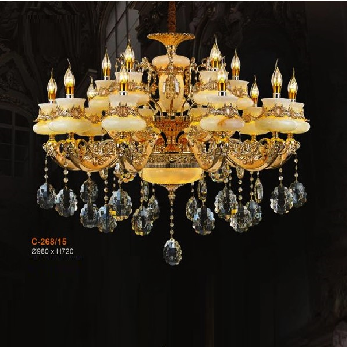 - Sản phẩm: E - C - 268/15: Đèn chùm 15 tay chao đá bạch ngọc - KT: Ø980mm x H720mm - Bóng đèn E14 x 15 bóng + Đèn LED