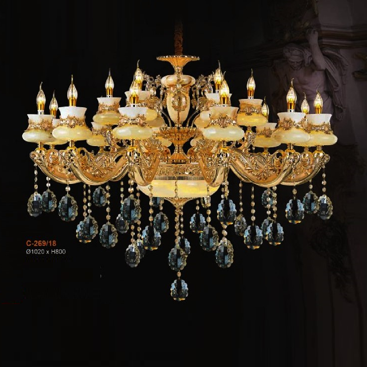 E - C - 269/18: Đèn chùm nến 18 tay chao đá bạch ngọc - KT: Ø1020mm x H800mm - Bóng đèn E14 x 18 bóng + Đèn LED