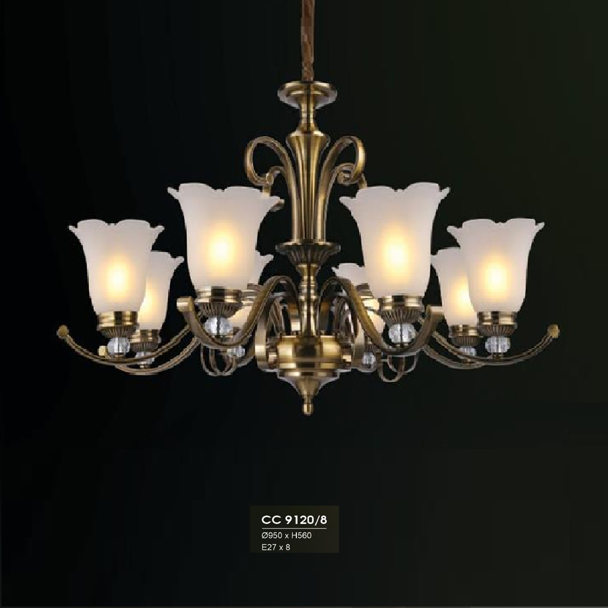 • Sản phẩm: HF - CC 9120/8: Đèn chùm 8 tay, chao thủy tinh - KT: Ø950mm x H560mm - Bóng đèn E27 x 8 bóng