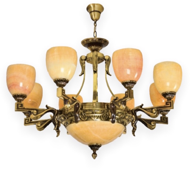 - Sản phẩm: E - CD - 758/8: Chùm đồng 8 tay chao đá - KT: Ø920mm x H800mm - Bóng đèn chân E27 x 11 bóng