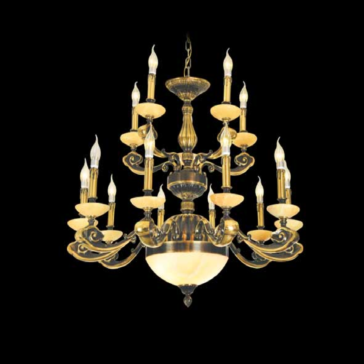 E - CD - 763/10+5: Chùm đồng 15 tay, chao đá - KT: Ø880mm x H900mm - Đèn chân E14 x 15 bóng + chân E27 x 3 bóng