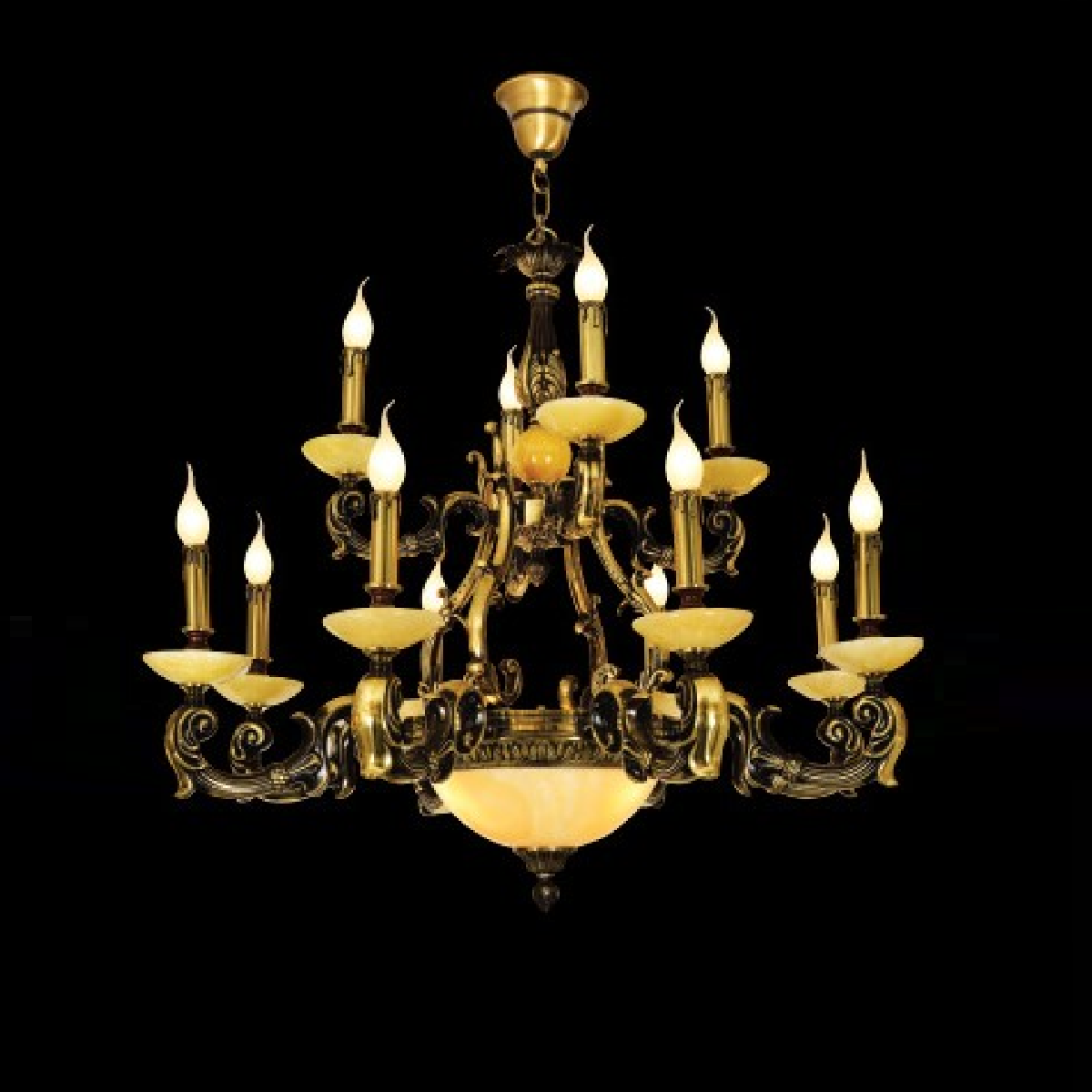 E - CD - 771/8+4: Chùm đồng 12 tay, chao đá - KT: Ø920mm x H900mm - Bóng đèn chân E14 x 12 bóng + E27 x 3 bóng