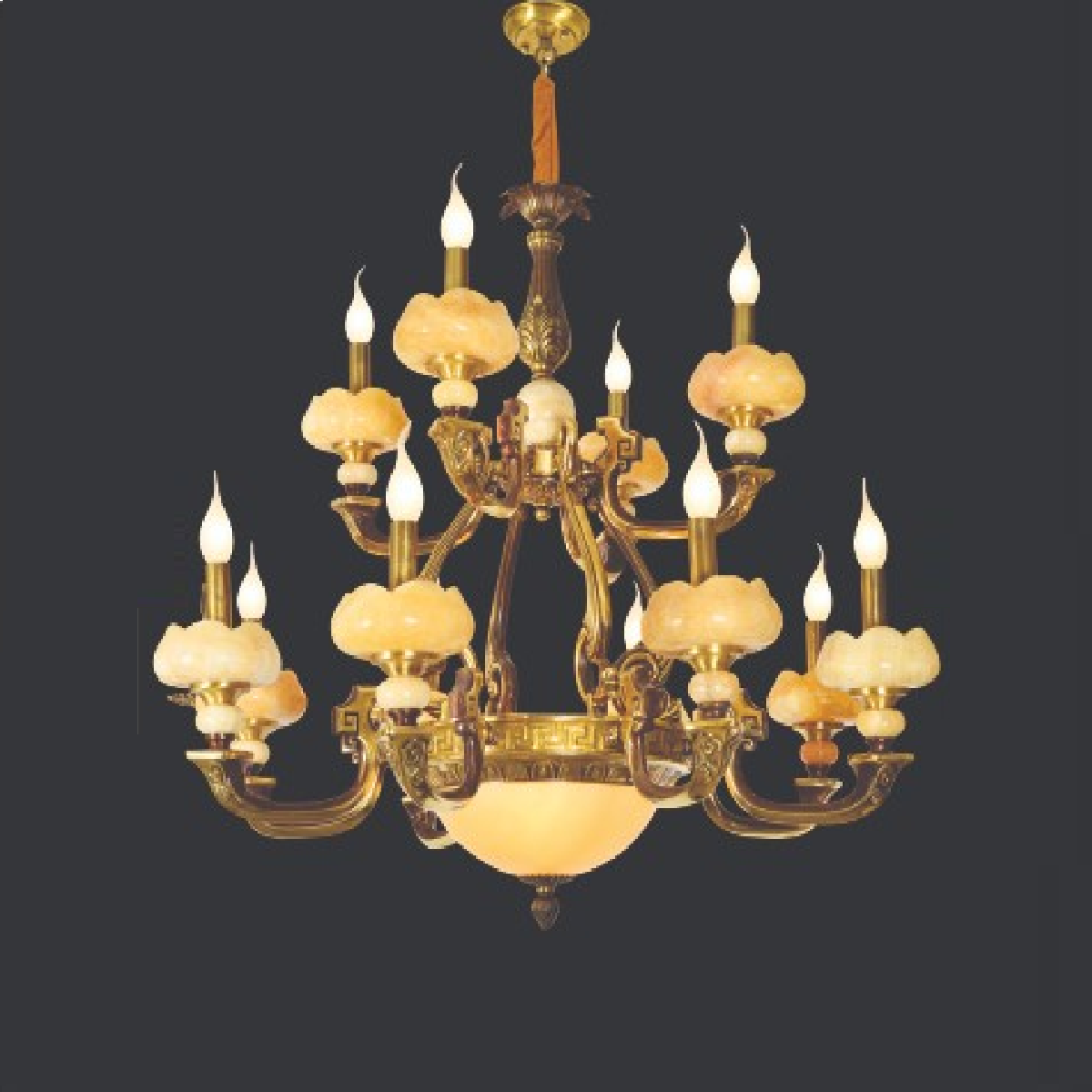 - Sản phẩm: E - CD 773/8+4: Chùm đồng 12 tay, chao đá có đèn LED - KT: Ø 900mm x H800mm - Đèn chân E14 x 12 bóng + E27x 3 bóng