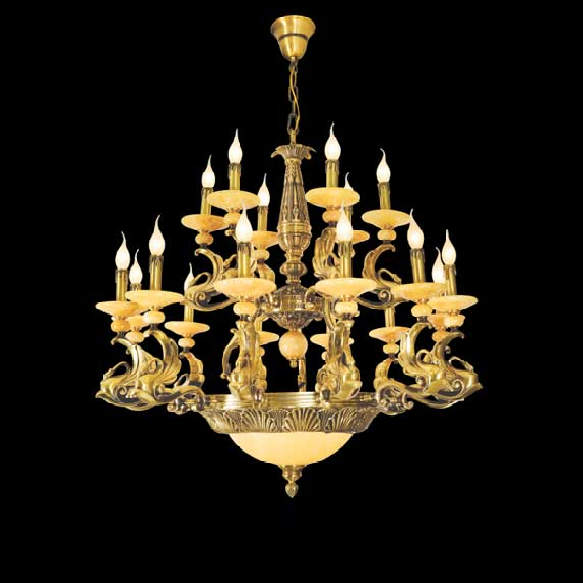 • Sản phẩm: E - CD - 777/12+6: Chùm đồng 18 tay, chao đá - KT: Ø950mm x H1100mm - Bóng đèn E14 x 18 bóng + E27 x 3 bóng